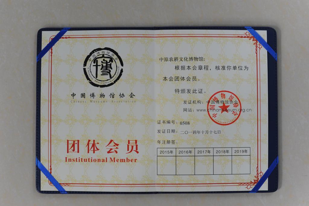 中国博物馆协会是依法登记的行业性、全国性非营利团体法人,旨在团结全国博物馆、博物馆社团组织和个人,发挥行业指导、自律、协调、监督作用,维护行业合法权益,促进博物馆管理水平和博物馆学术研究水平的提高,为促进中国博物馆事业科学发展,为促进中国特色社会主义文化强国建设服务。中国博协2014年10月25日中博协函【2014】135号文件批准中原农耕文化博物馆为中国博协团体会员。进入中国博协大家庭,标志着该馆在规范化建设上又迈出了重要一步。借助中国博协这一指导协调和交流互动的平台,中原农耕文化博物馆的内涵建设和社会影响力必将得到更好的促进和提升。