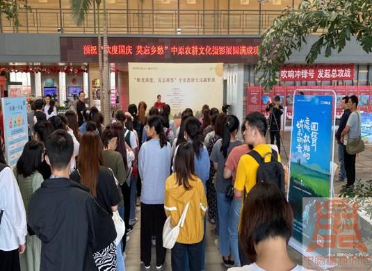 当天上午10:30,中原农耕文化博物馆与鄢陵建业绿色基地共同筹划举办的“欢度国庆.莫忘乡愁”中原农耕文化图片展顺利启动。图片来源于中原农耕文化博物馆“脱贫谢党恩·小康忆农耕”主题展览。该展览入选国家文物局向社会推介的2020年度百项 “弘扬优秀传统文化、培育社会主义核心价值观”主题展览,是此次国展中唯一一项以农耕文化为主题的展览。许昌学院47名大学生借助鲜活的农耕图片,向入园参观的游客进行义务讲解,让游客真切地感受到农耕文化的无穷魅力和特有的文化价值,游客们在欣赏游玩中也增加了人文情怀和文化自信。