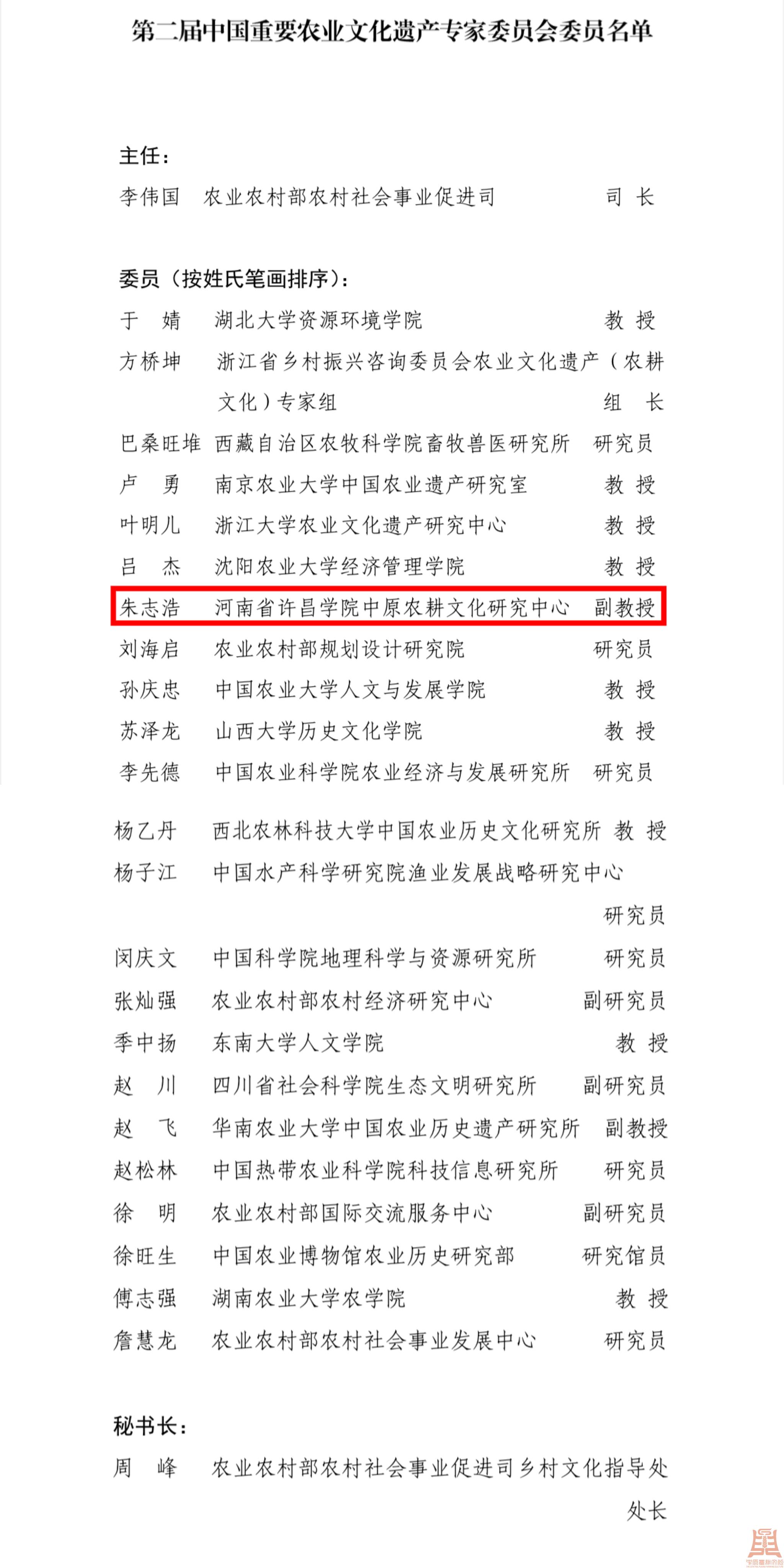 近日,国家农业农村部办公厅正式发布《农业农村部办公厅关于成立第二届中国重要农业文化遗产专家委员会的通知》(农办社〔2023〕5号),成立第二届中国重要农业文化遗产专家委员会,聘请来自全国23家单位的25名专家担任专家委员会委员。我校中原农耕文化研究中心副主任、中原农耕文化博物馆副馆长朱志浩博士入选专家委员会委员。