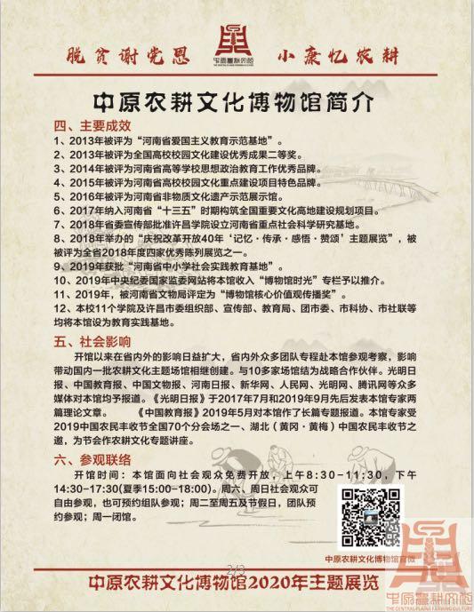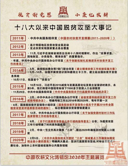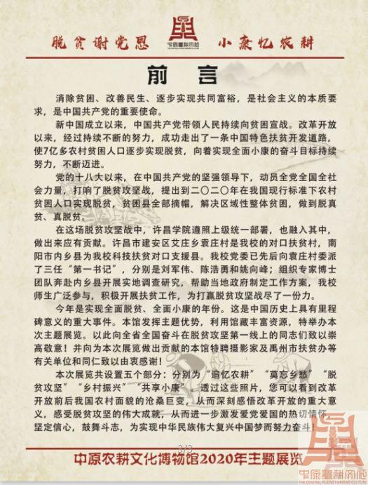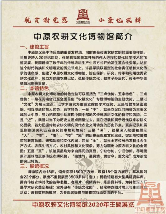 今年是实现全面脱贫、全面小康的年份。这是中国历史上具有里程碑意义的重大事件。本馆发挥主题优势,利用馆藏丰富资源,特举办“脱贫谢党恩·小康忆农耕”主题展览。展览分为两大部分,一是农博馆室内器物陈展,共18个展厅,22个部分,系统化、全景式展现中原地区传统农耕时代生产生活方式和境况;二是设在室外传统文化园的大型图片展,共设置五个部分:分别为“追忆农耕”“莫忘乡愁”“脱贫攻坚”“乡村振兴”“共享小康”。制作展出抗风抗雨抗晒的展版共计166版,展出馆藏原创纪实图片500多幅,这些图片真实记录了中原大地改革开放前后农业、农村、农民所发生的沧桑巨变。