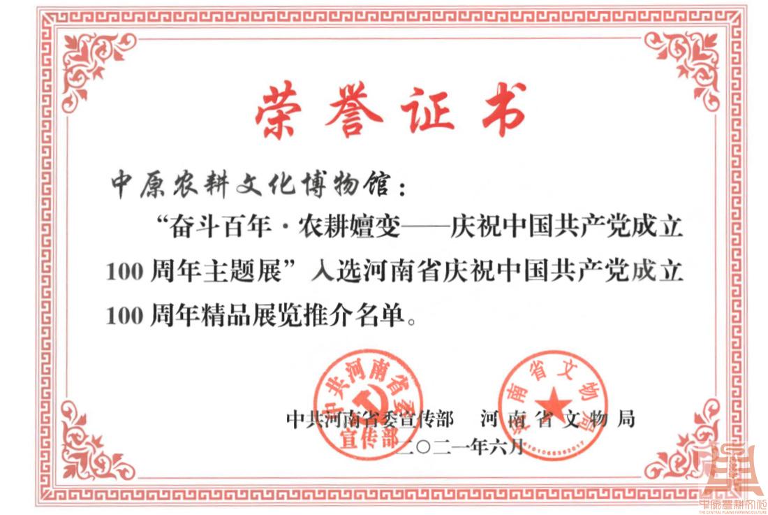 近日,河南省委宣传部、河南省文物局公布了庆祝中国共产党成立100周年精品展览推介名单并颁发荣誉证书。中原农耕文化博物馆的“奋斗百年·农耕嬗变”主题展览入选其中。