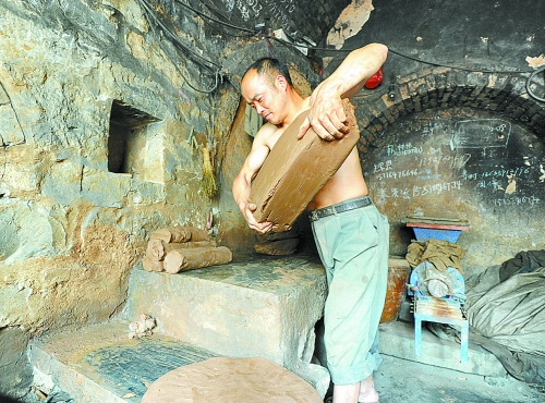 夏日午时,闷热当头。当来到张红才的窑洞时,这里却清凉无比,此时,他正坐在“辘轳车”前做着“拉坯”。只见一米见方的“辘轳车”的托盘上放着约十公斤左右的泥料,在托盘的旋转下,逐渐变成一口秀气的陶缸。他的动作因为操作熟练而显得格外轻灵:“要用力均衡,观察要细,把握分寸,才能做好陶器”。从7岁开始跟父辈学徒,做“拉坯”60多年的张红才对自己的手艺特满意,与红泥土打了几十年交道的心里留存了他太多太多的记忆。