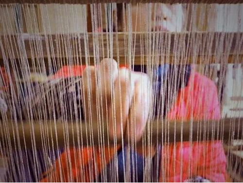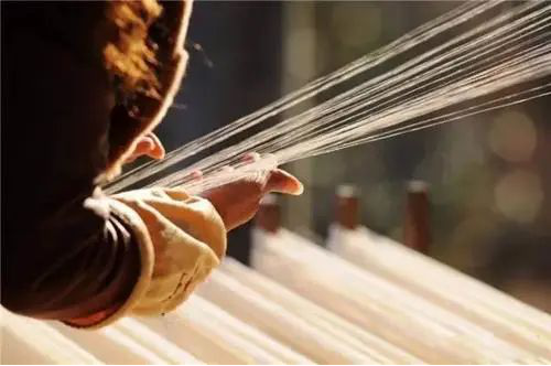 纱锭做成后,几位织女在开阔地上一边两端各楔一根木桩,另一边把一排筷子固定在地面上,纱锭竹筒一个挨一个套在筷子上。一位织女手里攥住所有纱锭的线头,把纱线固定在一端木桩上,然后拉动纱线在两根木桩间来回跑动,把锭上纱线全都盘在两个木桩上,这就是布匹的经纱。经纱的长度决定着布匹的长度,经纱的数量决定着布匹的宽度和密度。